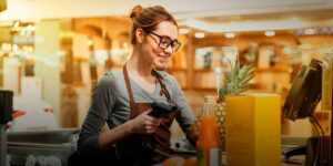 Jovem mulher registrando vendas no caixa com um leitor de código de barras.